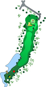 Wer sich von dem großen Teich auf der linken Seite nicht abschrecken lässt, kann hier mit einem guten Drive etliche Meter abkürzen. Ein kurzes Eisen als zweiter Schlag sollte sicher auf dem Grün landen. Gute Birdie Chance.